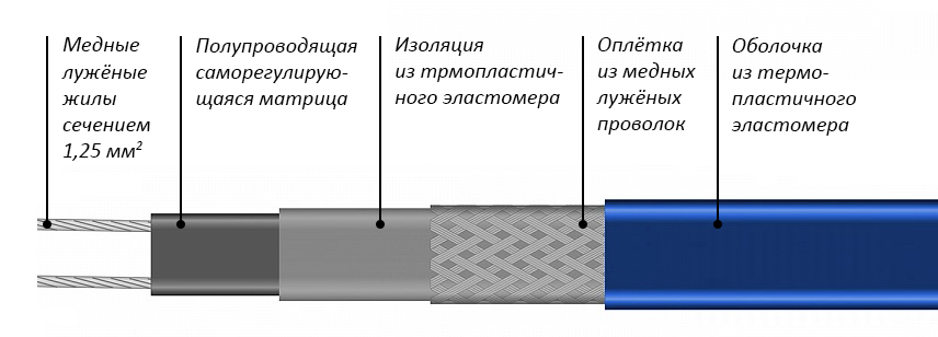 Саморегулирующийся кабель — автоматически регулирует мощность, в зависимости от окружающей температуры. Теплоотдача по всей длине кабеля может быть разной. Минимальный риск перегрева.