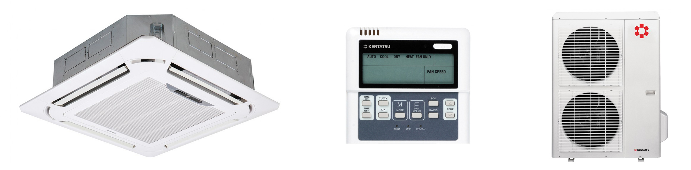 Кассетный кондиционер Kentatsu KSVQ140HFAN3/KSUT140HFAN3 встраивается в подвесную потолочную конструкцию, рассчитан на охлаждение и обогрев помещения площадью до 140 кв.м.