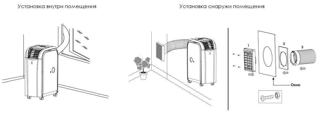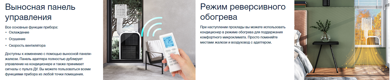 Уникальный мобильный кондиционер для внутреннего и наружного использования. Корпус имеет пыле-влагозащиту IP24, что позволяет устанавливать моноблок на балконе, веранде или улице (под навесом, во избежание попадания влаги внутрь прибора). В комплект входит специальная панель-жалюзи с блоком управления кондиционером, которая встраивается в окно или специально подготовленное отверстие. Таким образом кондиционер, установленный снаружи, через воздуховод будет подавать охлажденный воздух внутрь помещения, не занимая при этом жилое пространство и существенно снижая уровень шума при эксплуатации. Прибор можно также использовать для направленного охлаждения, используя на верандах и летних площадках.