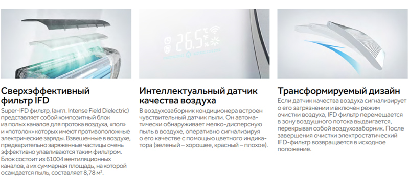 Профессиональная очистка воздуха (IFD фильтр) — Кондиционер + очиститель воздуха в одном устройстве. Датчик качества воздуха кондиционера анализирует концентрацию частиц более 2,5 мкм. Если воздух в помещении загрязнен, новейший IFD фильтр перемещается в зону воздушного потока. IFD фильтр – это пористый материал включающий более 8616 отверстий-пор улавливающих самые мелкие частицы. Если функция очистки активирована, на фильтре формируется статическое электричество, повышающее эффективность фильтрации.