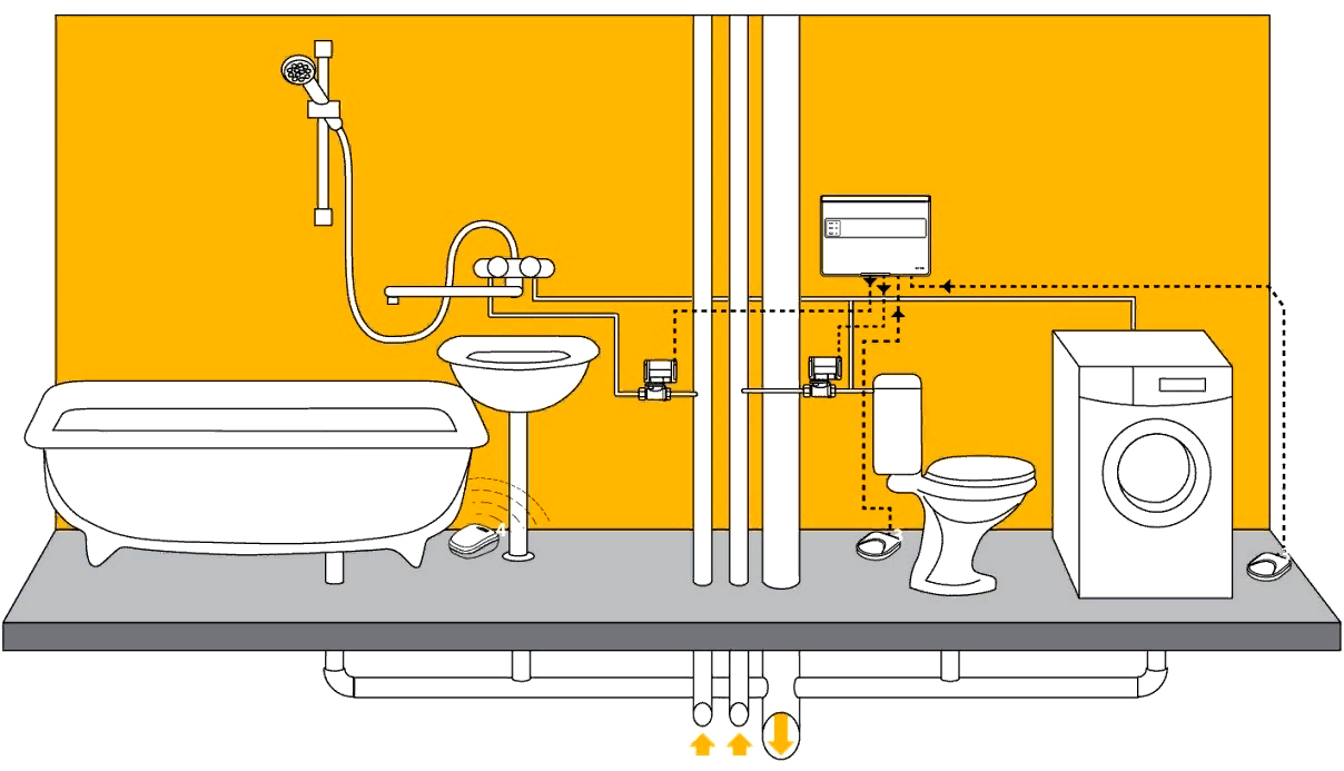 - Датчик, установленный в местах вероятного скопления воды, обнаружив протечку, подает сигнал на модуль управления системой;