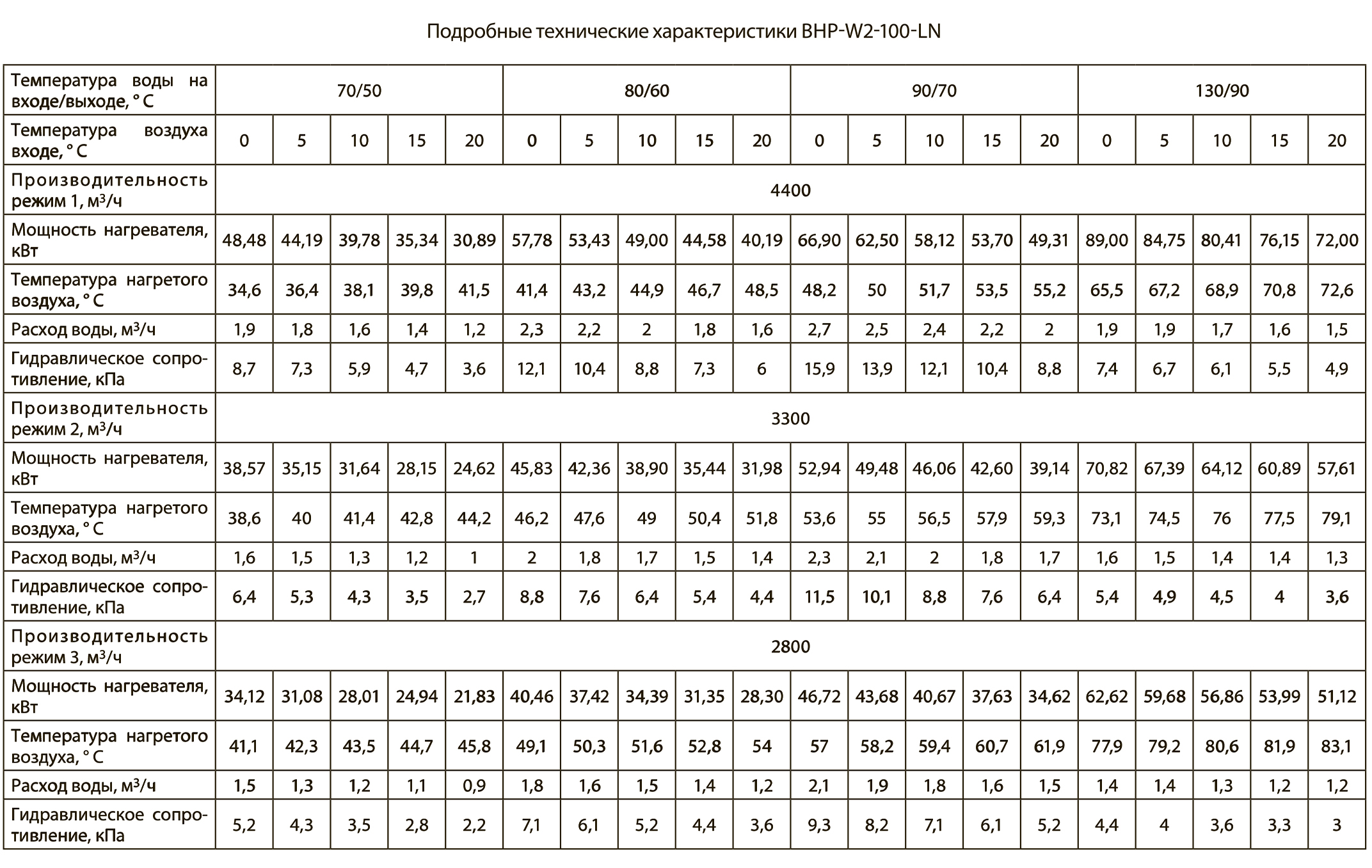 Тепловые характеристики приведены при температуре воздуха на входе +0 °С, максимальном расходе воздуха и максимальной температуре теплоносителя (указанной в таблице тепловой мощности от производителя).