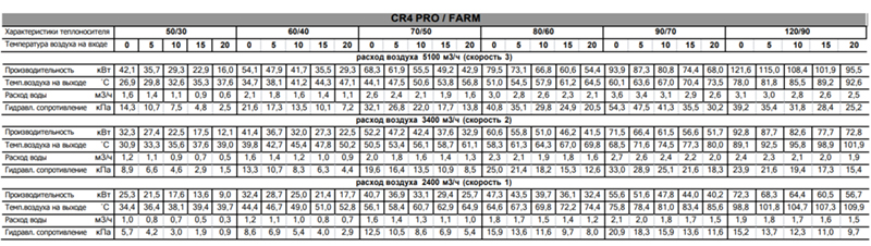 Тепловые характеристики приведены при температуре воздуха на входе +0 °С, максимальном расходе воздуха и максимальной температуре теплоносителя (указанной в таблице тепловой мощности от производителя).