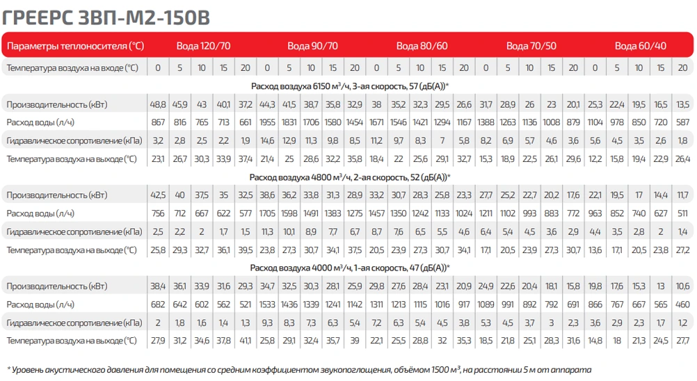 Условная тепловая мощность водяной завесы указанна в кВт.ч при температуре подаваемой воды +95°С / её охлаждением до +70°С / температура окружающей среды +15°С. При изменение любого из показателей мощность будет отличаться от заявленной. (См. технические характеристики модели)