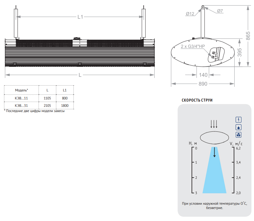 Условная тепловая мощность водяной завесы указанна в кВт.ч при температуре подаваемой воды +95°С / её охлаждением до +70°С / температура окружающей среды +15°С. При изменение любого из показателей мощность будет отличаться от заявленной. (См. технические характеристики модели)
