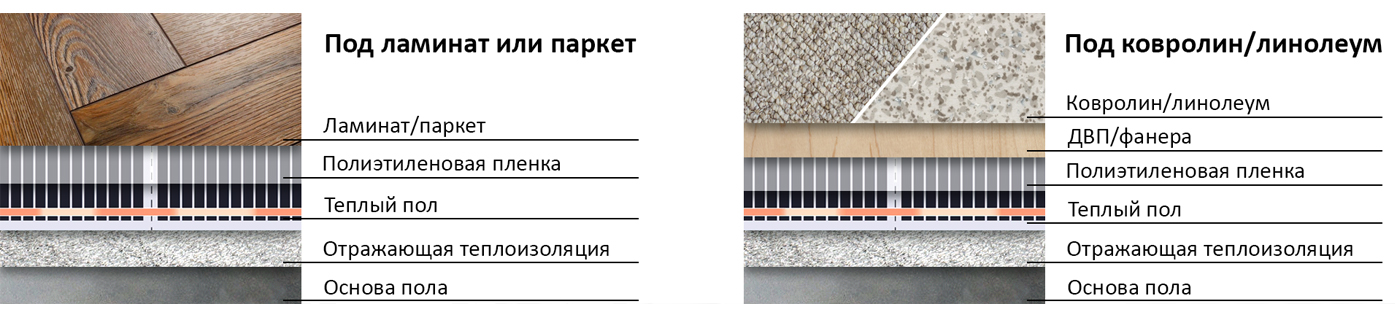 - При использовании под мягкие напольные покрытия (ковролин, линолеум) поверх пленки необходимо так же постелить ДВП или фанеру.