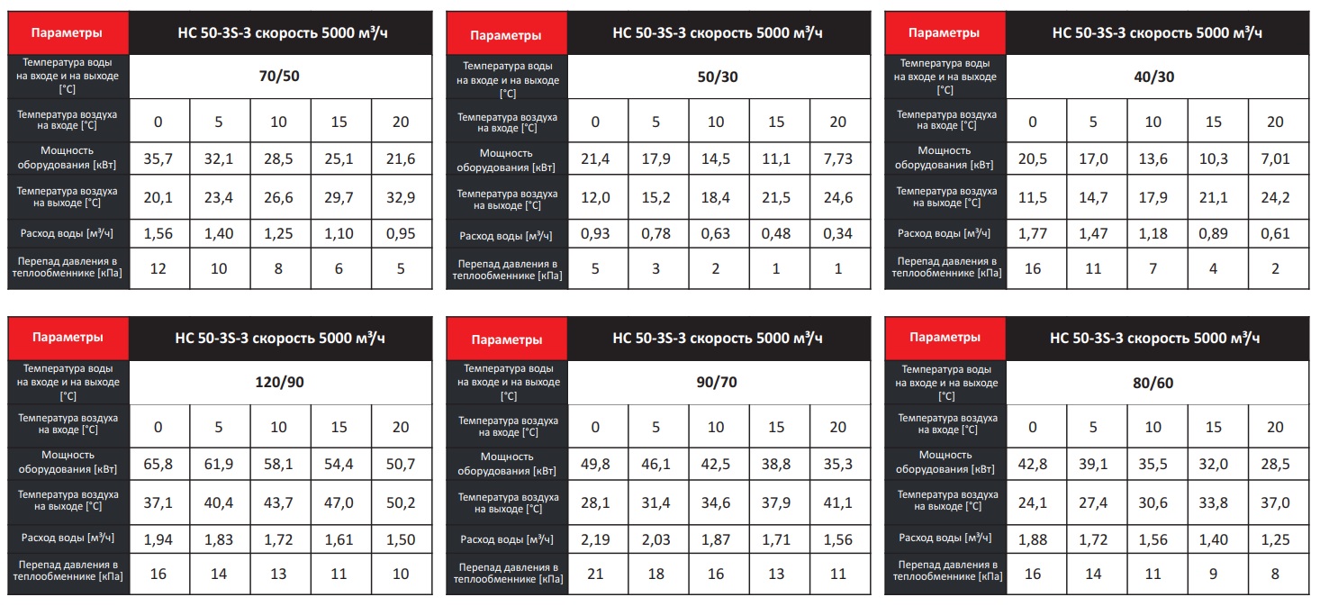 Тепловые характеристики приведены при температуре воздуха на входе +0 °С, максимальном расходе воздуха и максимальной температуре теплоносителя (указанной в таблице тепловой мощности от производителя).